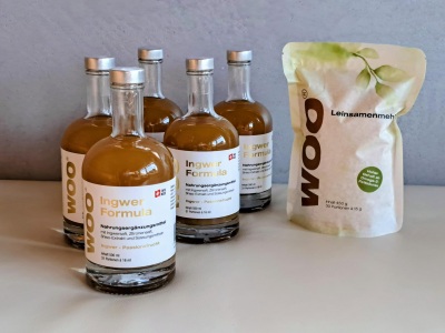 Sie erhalten für 195.- CHF 5 Flaschen WOO Ingwer und dazu eine Packung WOO Leinsamenmehl gratis mitgeliefert. NETTOARTIKEL